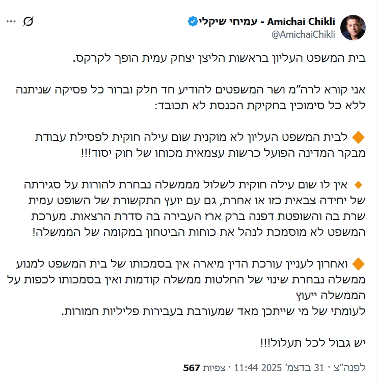 השר שיקלי:העליון בראשות יצחק עמית הופך לקרקס | קורא לרה״מ ושר המשפטים להודיע חד חלק וברור כל פסיקה שניתנה ללא סימוכין בחקיקת הכנסת לא תכובד!