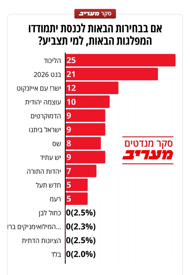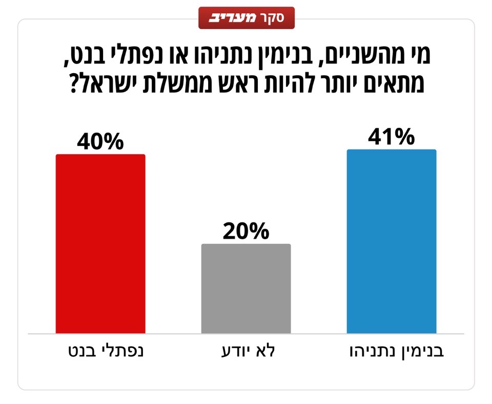 כמעט שוויון בהתאמה לראשות הממשלה בין נתניהו (41%) לבנט (40%) האופוזיציה עולה במנדט ומגיעה ל־60 – איזנקוט מתחזק משמעותית<br /><br />משה כהן<br />06:00 13/02/2026<br /><br /><img src="https://rotter.net/User_files/forum/698ea8b1f10f66991.jpg" alt="" /><br /><br /><img src="https://rotter.net/User_files/forum/698ea8bcf134c1711.jpg" alt="" /><br /><br /><img src="https://rotter.net/User_files/forum/698ea8c1f148222b1.jpg" alt="" /><br /><br />https://www.maariv.co.il/news/politics/article-1284320